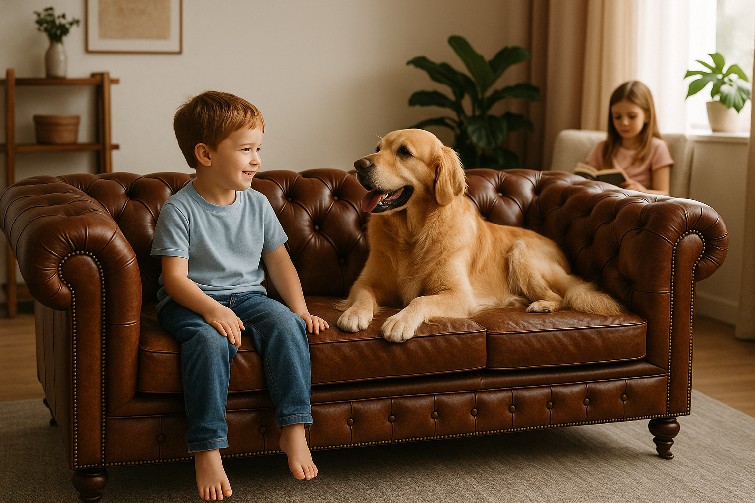 Wenn Haustiere im Haus sind, kann eine Decke oder Tagesdecke das Sofa zusätzlich schützen. Für Katzen hilft ein Kratzbaum oder Kratzschutz, damit das Chesterfield Sofa verschont bleibt. Für Kinder gilt: Chesterfields sind erstaunlich robust – selbst Springaktionen halten sie oft mühelos aus.